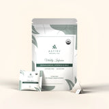 A revitalizing tea blend with ashwagandha, moringa, and amla, complemented by hibiscus and rosehip for a naturally soothing taste. Its delicate pink hue and gentle flavor make every sip a refreshing boost to your vitality and well-being. The sachets are made from non-toxic, plant-based materials to ensure a high-quality tea experience.